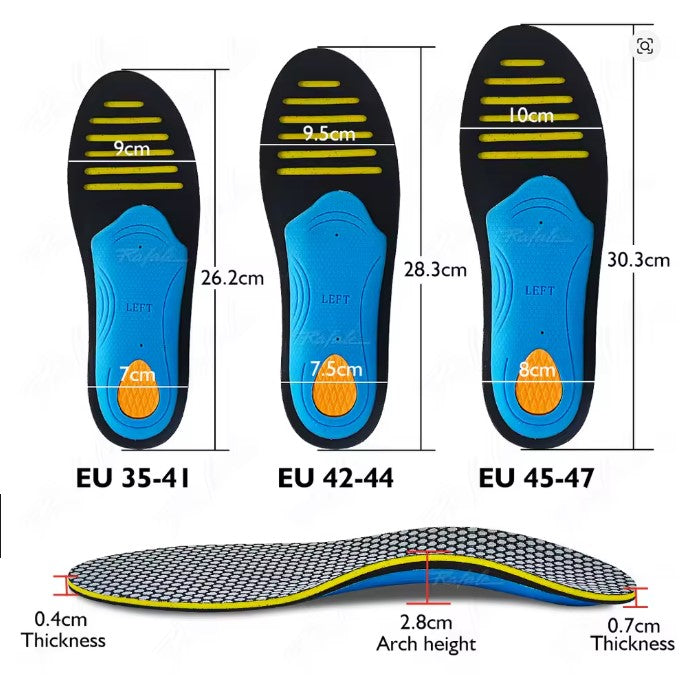 • Comfort: Deze inlegzolen zijn ontworpen om extra comfort aan je schoenen toe te voegen en vermoeidheid van de voeten te verlichten. Ze bieden optimale ondersteuning en demping, zonder het ongemak van overmatige voetboogondersteuning.