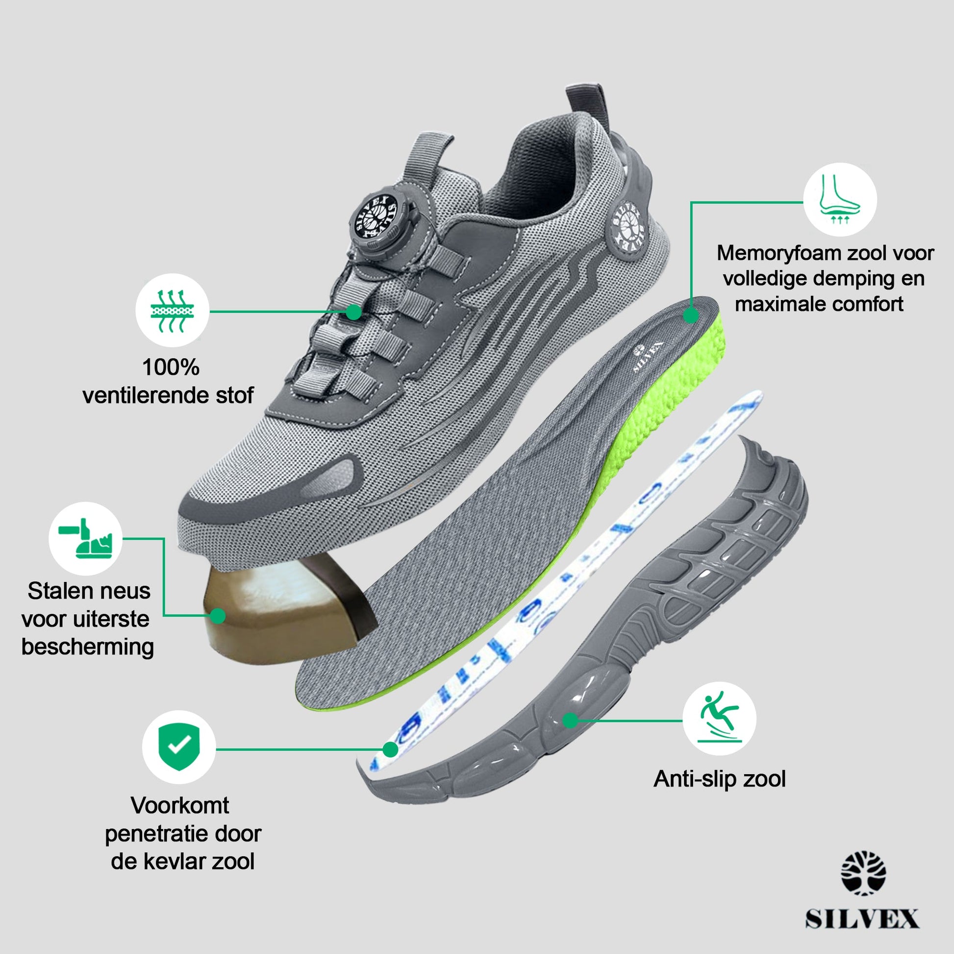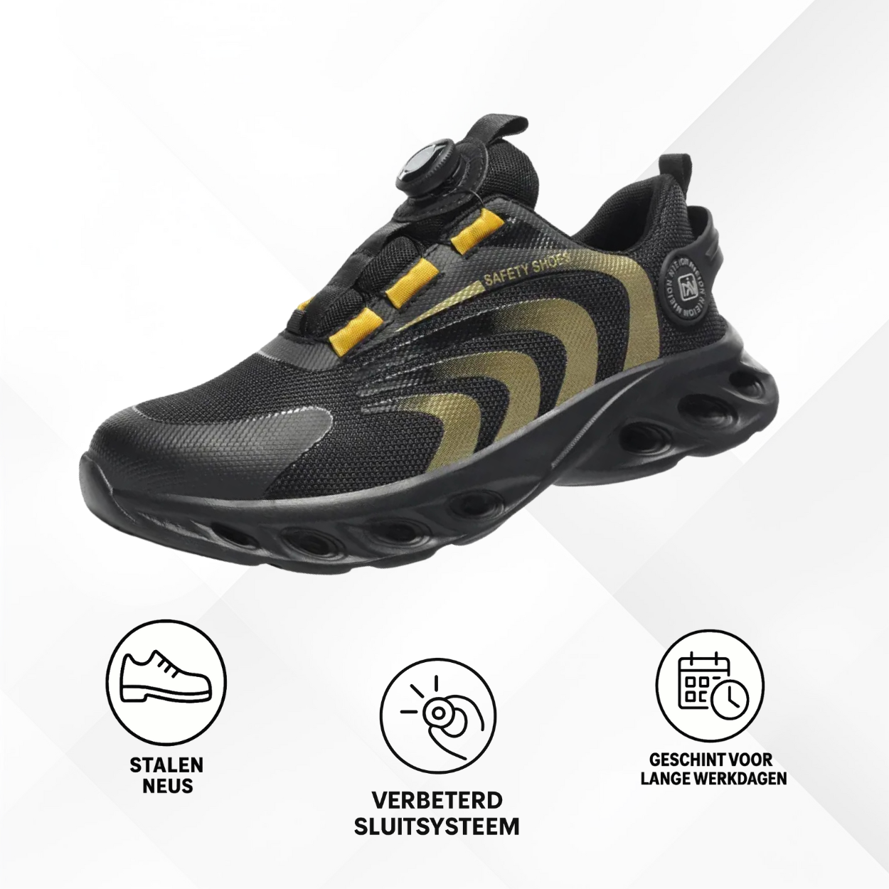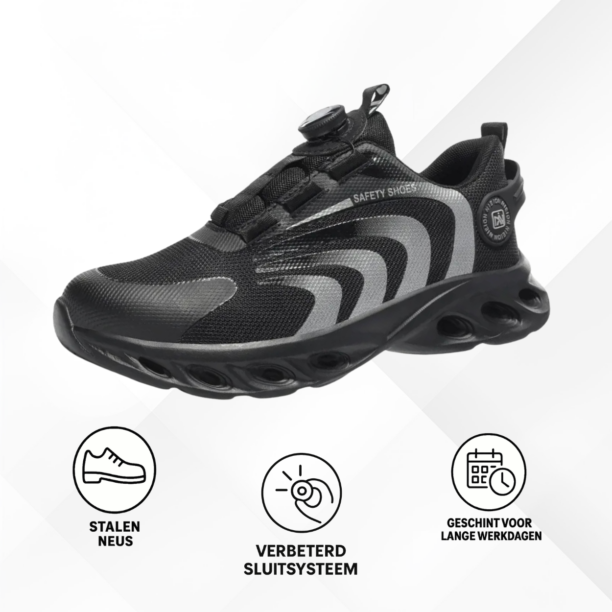 Schoenen voor veiligheid en bescherming met draaibare vetersluiting Kies voor veiligheid zonder concessies met onze beschermende werkschoenen voor heren en dames. Dankzij het innovatieve draaisluitingssysteem bieden deze schoenen een stevige en snelle pasvorm voor maximaal comfort op het werk. Ze zijn ontworpen volgens de hoogste veiligheidsnormen en combineren betrouwbare bescherming met gebruiksgemak dankzij het praktische sluitsysteem. Deze schoenen zijn de perfecte combinatie van stijl en functionaliteit voor wie het beste verlangt op de werkvloer. Trek ze aan en werk met vertrouwen.